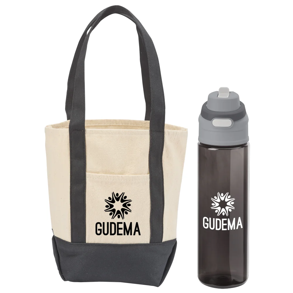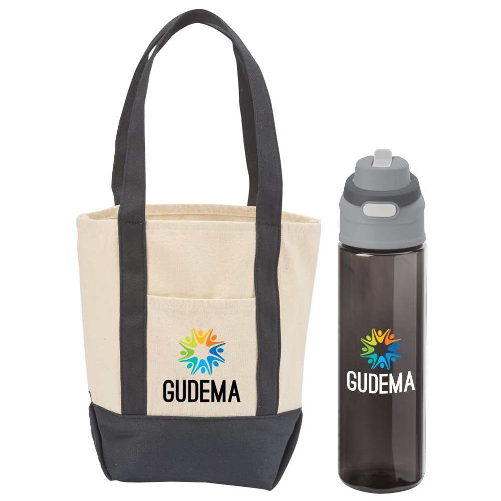 2-piece gift set includes: Tritan™ Dual-Sip Water Bottle 28 oz. With Carry Handle & Cotton Canvas Market Tote Bag