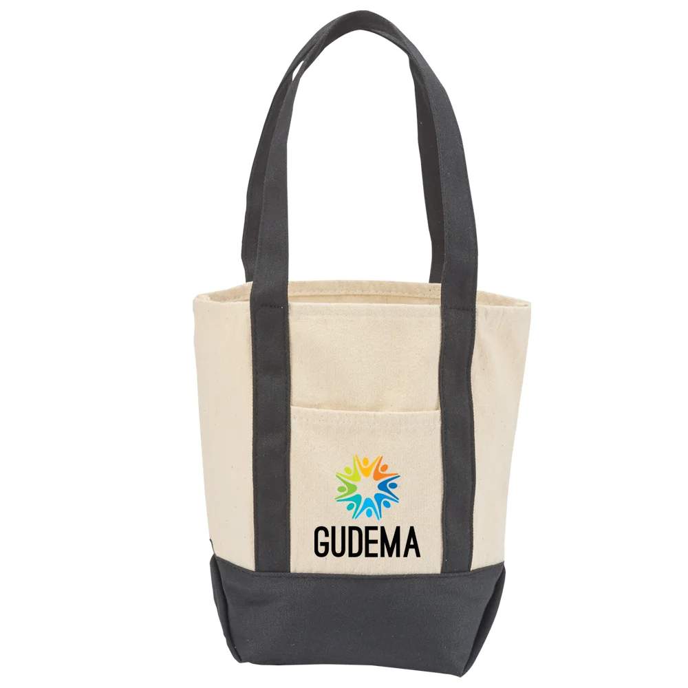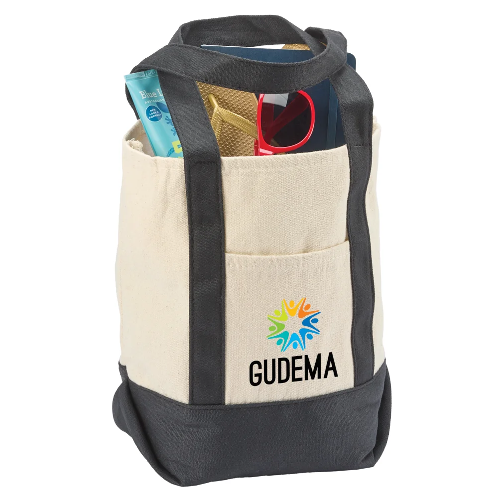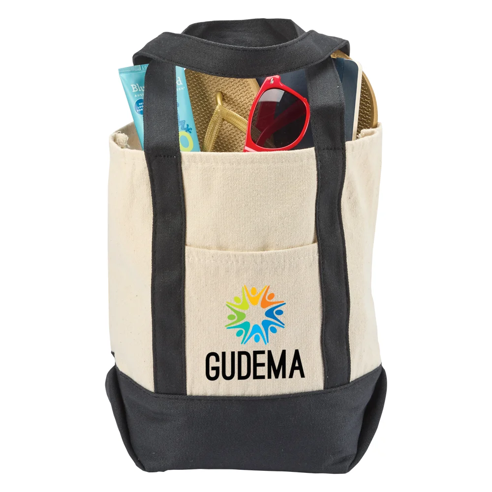 Personalized Cotton Tote: Open-top design; Natural color with contrasting shoulder straps and trim; Easy-access front pocket; 320-gsm. sustainable blend of 70% recycled 10-oz. cotton canvas / 30% polyester; 18" handles fit comfortably over shoulder