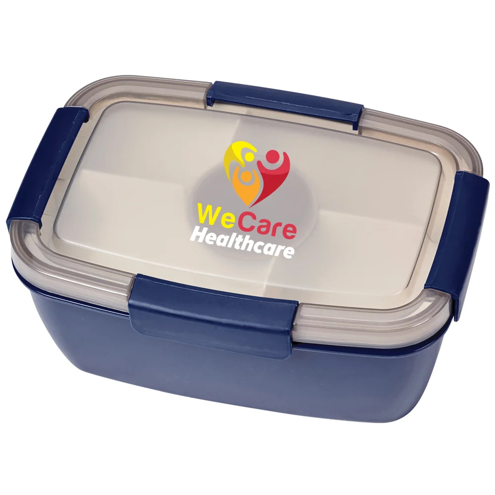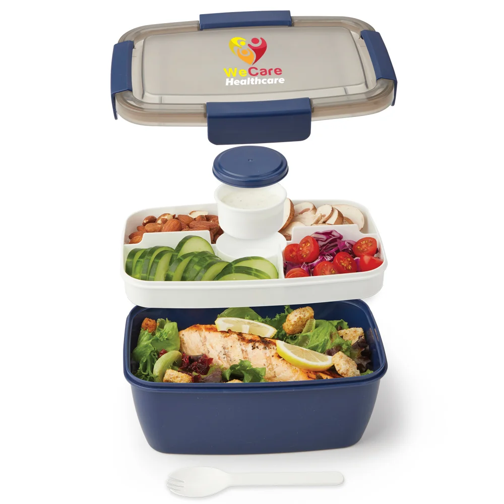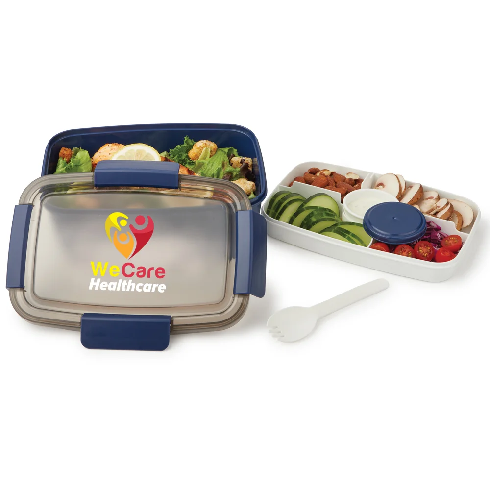 Personalized Stacker Container: Two plastic, rectangular stacking containers with a hinged, locking lid; Fork included; Airtight lid with silicone ring seals in freshness and prevents spills; Large bottom container holds 68 oz. (8.5 cups); 4-compartment top tray (2 sections hold 5 oz., 2 hold 3.5 oz.) separates snacks; Lidded, removable 3-oz. container stores dressing, toppings, or sauces; Eco friendly; Reusable; BPA free; Note: Microwave and freezer safe; Dishwasher safe after lid and compartments removed