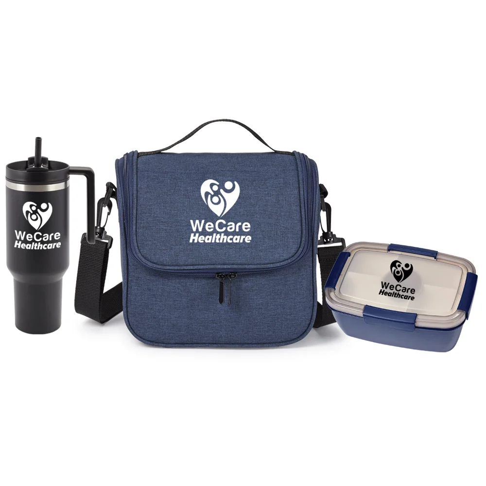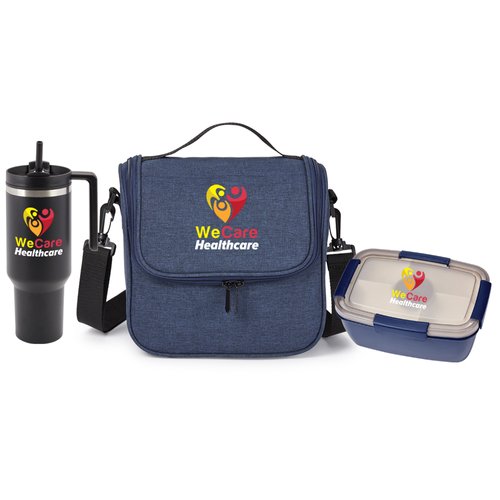 3-piece gift set includes: Quencher Stainless-Steel/Plastic-Lined Tumbler 40 oz. With Handle, Portland Lunch/Cooler Bag, & Locking Stacker Food Container 68 oz.