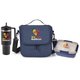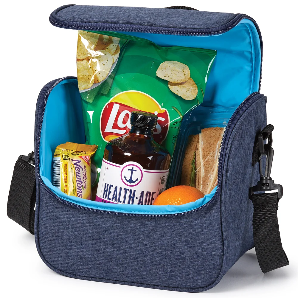 Personalized Lunch/Cooler Bag: Dual-zip, foam-insulated, leak-resistant compartment ideal for stacking containers or up to 6 cans with ice; Interior is easy to wipe clean in case of any spills; Fits most food containers for convenient meals on the go; Exterior slip pocket for napkins and quick-grab items; Heathered 300-denier material with bright-blue lining and PEVA foam insulation; Adjustable, removable strap for shoulder or crossbody carry; Top carry handle; ID window on the back