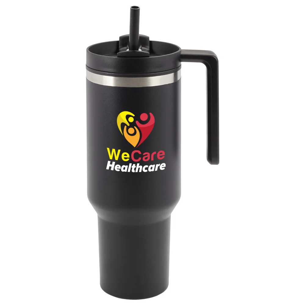 Personalized 40-oz. Tumbler: Double-wall insulated tumbler: stainless-steel outer and plastic liner; Maintains optimal hot or cold temperature; Splash-proof, threaded, 3-position rotating lid: Straw opening with included reusable straw, drink opening, & fully sealed; Sturdy handle for a sure grip; Tapered base fits most car cup holders; Eco friendly; Reusable; BPA free; Note: Tumbler: Hand-wash only; Straw: Dishwasher safe