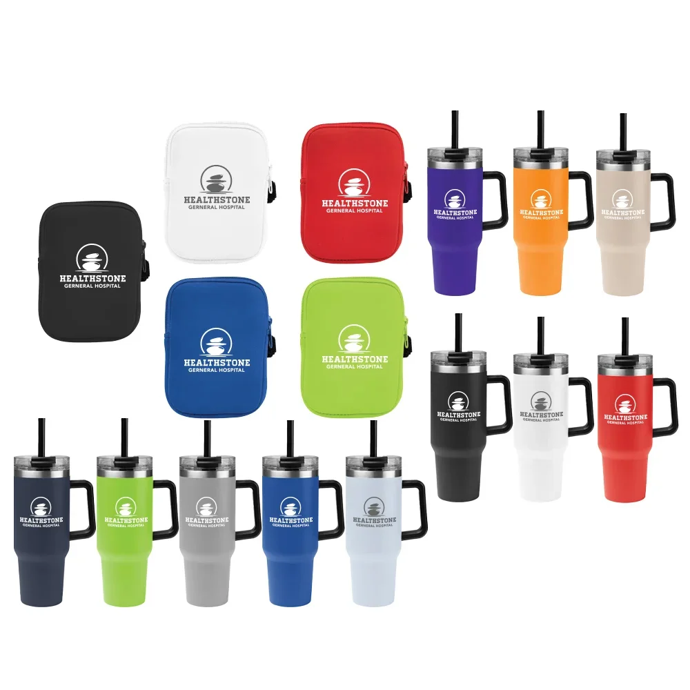 Personalized Bottle Pouch: Made of 3-mm. neoprene; Fits the included 40-oz. tumbler; Zippered main compartment; Adjustable strap with hook-&-loop closure and rubber grips to prevent sliding; Spot clean/air dry