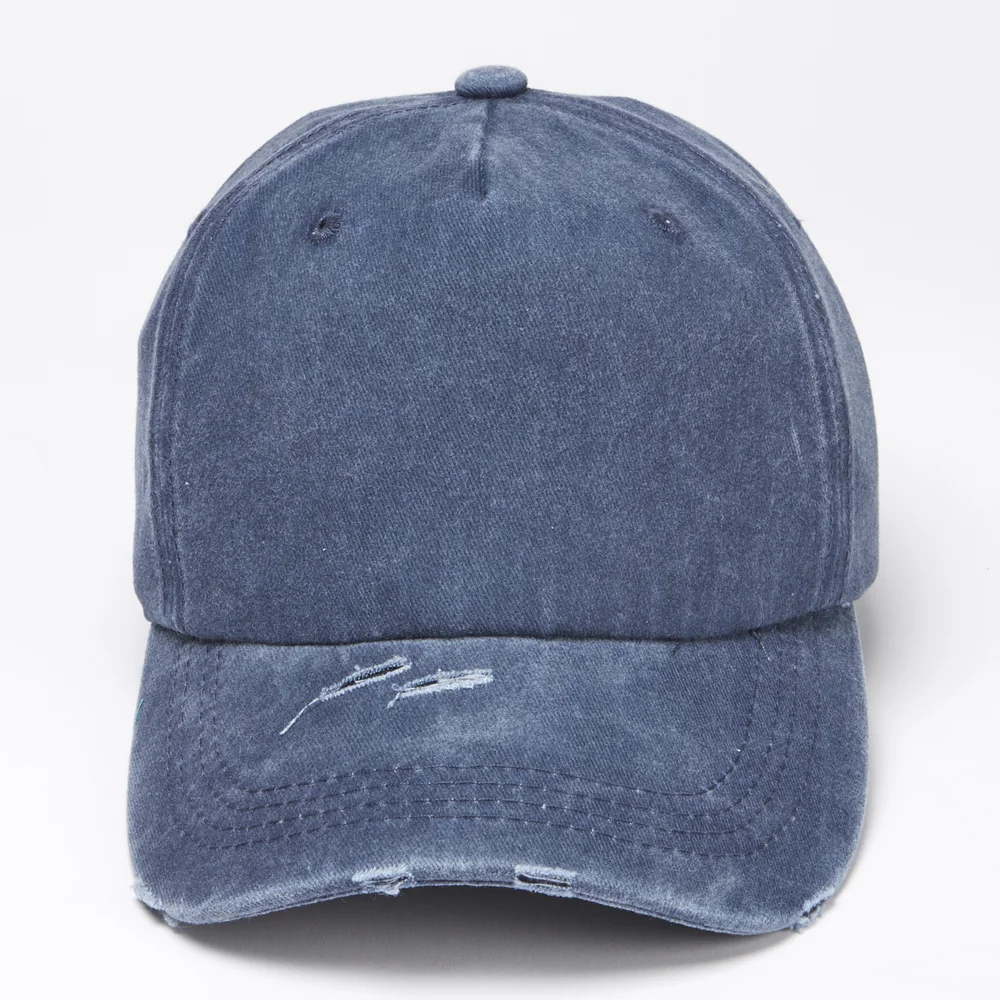 • Fresh take on the classic baseball cap offers a cool, in-fashion distressed look.