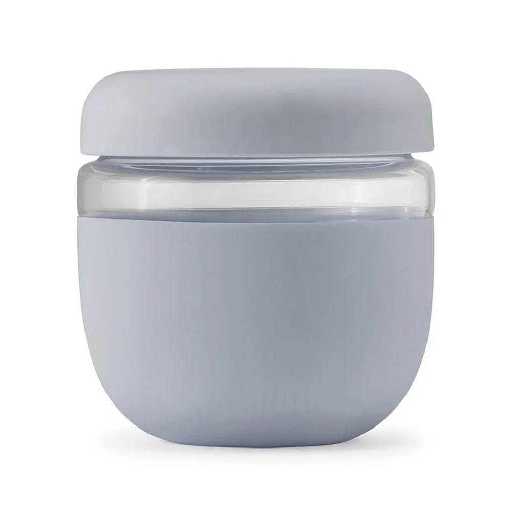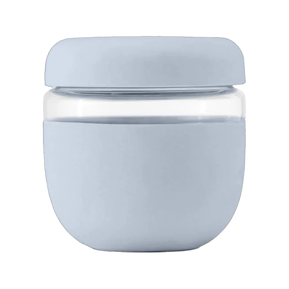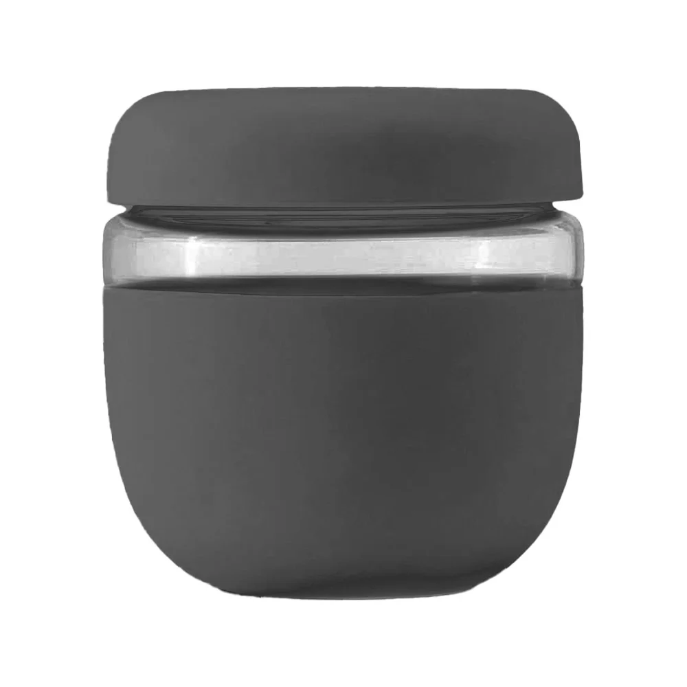 Bowl: Holds 24 oz.; A plentiful serving size for yogurt and fruit, soup, pasta, and much more; Leak-proof screw-on lid; Made of borosilicate glass and wrapped in protective matte silicone