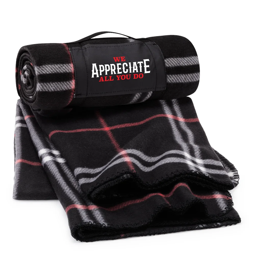 Blanket: Compact roll-up blanket makes it easy to grab a quick nap at break time or to enjoy cozy warmth any time; 340-g., 190-gsm., 100% recycled polyester microfleece is soft, durable, and machine washable; Keep comfy indoors or out, wherever and whenever a little extra warmth is needed; Rolls up and secures with removable straps for easy portability; Eco friendly; Recycled materials; 60" x 48" unfolded