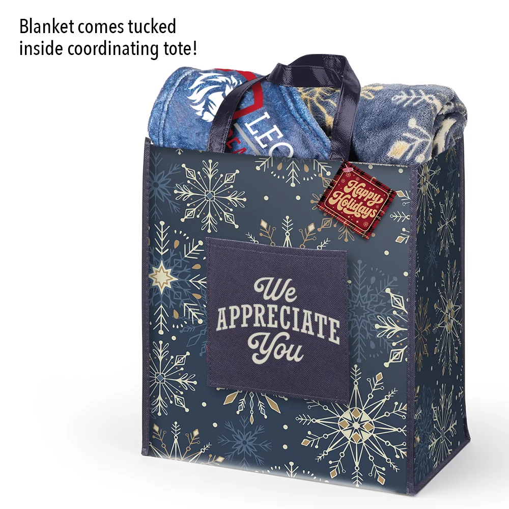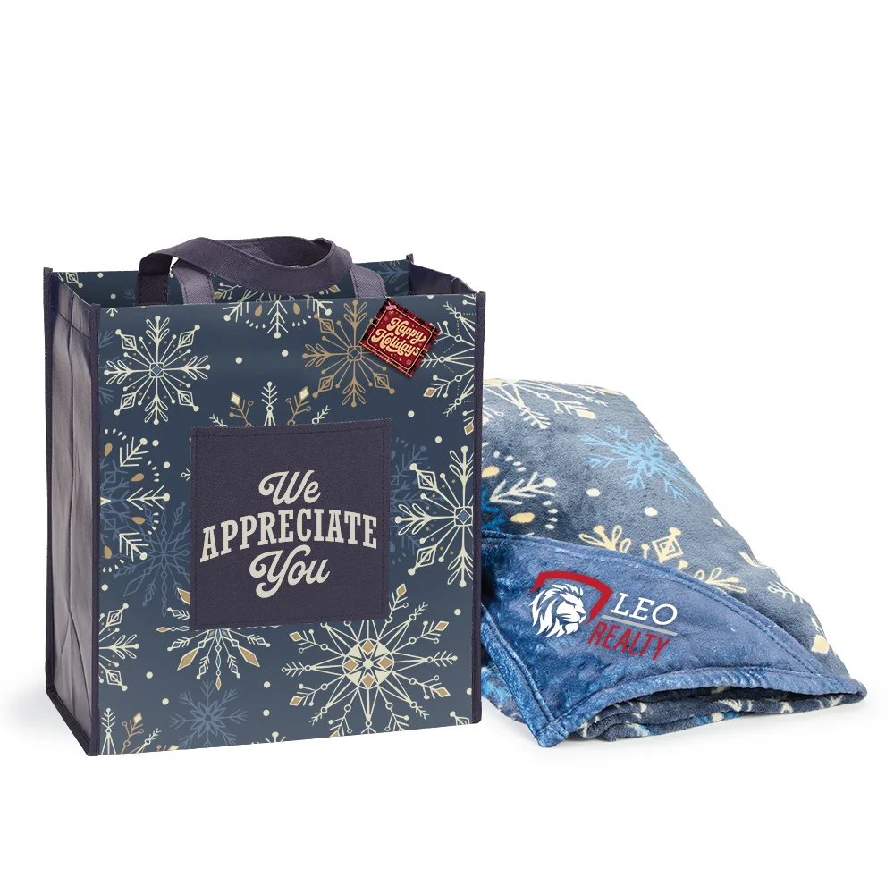 Two great gifts bundled up in one extra-special present! Set includes: Mink Fleece Blanket & Laminated Eco-Shopper Tote Bag - both decorated with a snowflake pattern