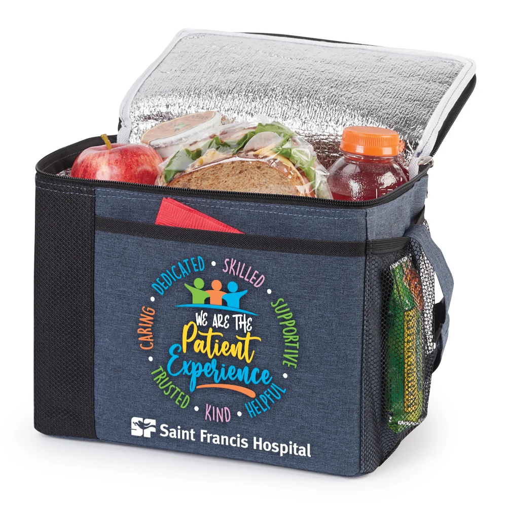 Lunch/Cooler Bag: Reusable bag that keeps contents fresh on the go; Flip-top lid with zip-around closure; Two zipper pulls for full access to large compartment; Front slip pocket for utensils or small essentials; Side mesh pocket stores even more; Insulated lining is easy to wipe clean; Strap adjusts for hand or shoulder carry; ID window on back; Holds up to 8 cans; Heathered 300-denier polyester with contrast trim