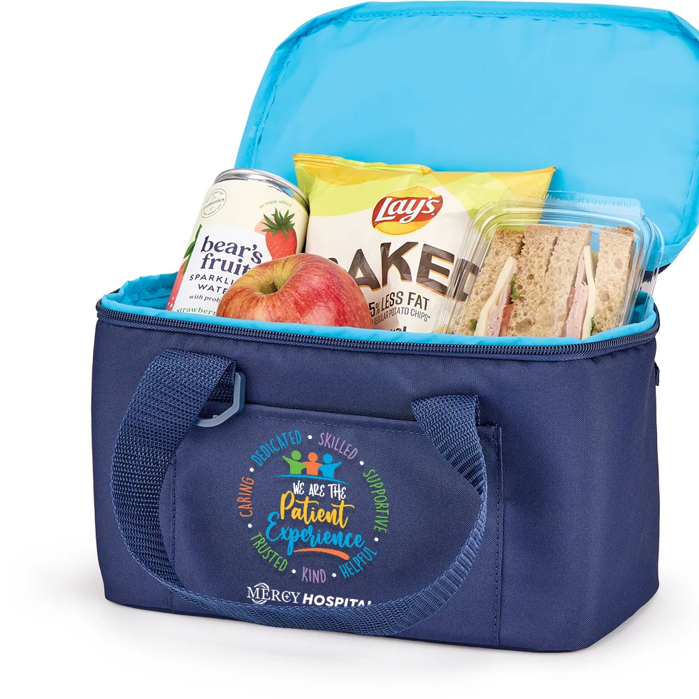 6-Can Cooler Bag: Insulated, leak-resistant compartment ideal for carrying meals, snacks, and beverages; Holds up to 6 cans with ice; Flip-top, zip-around lid for easy access; Front slip pocket for napkins and quick-grab items; Easy-carry reinforced handles; D-ring for keys; ID window on back; 300-denier recycled polyester (rPET); Easy-clean, bright blue lining; PEVA foam insulation