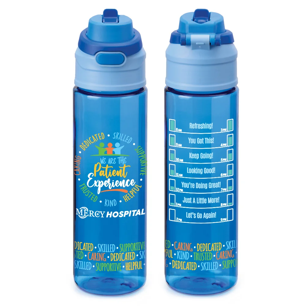 28-oz. Water Bottle: Dual-function, push-button, spill-proof locking lid; Sip: flip up built-in spout to sip through internal straw; Chug: push button to unlock lid and access the wide opening; Extra-wide mouth for easy filling and cleaning; Easy-carry loop built into lid; Tough, impact-resistant, and shatter-resistant Tritan™; Hydration messages on back; Positive words all around bottom; Eco friendly; Reusable; BPA free; Note: Hand wash recommended
