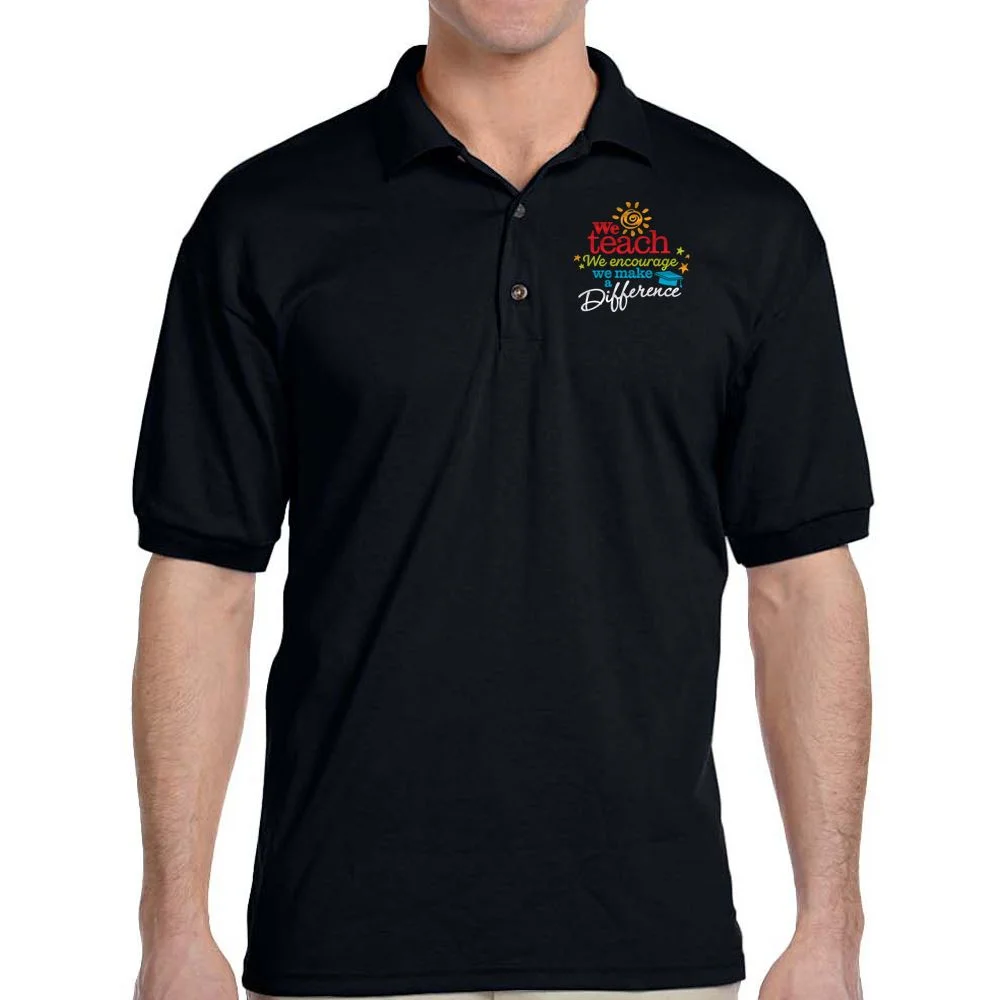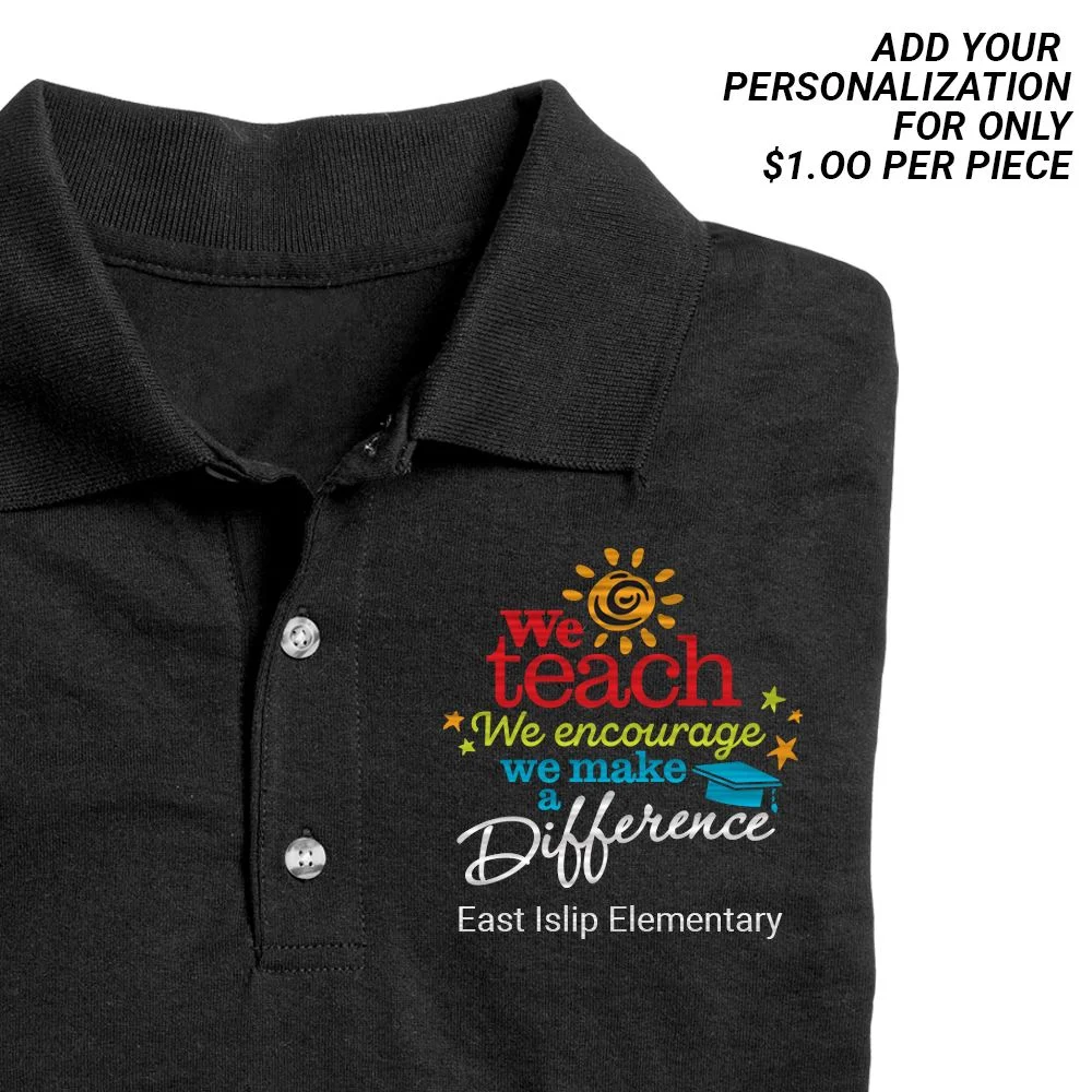 Features our exclusive We Teach We Encourage We Make A Difference design on upper left chest; embroidered personalization optional below design for only $1.00 per shirt