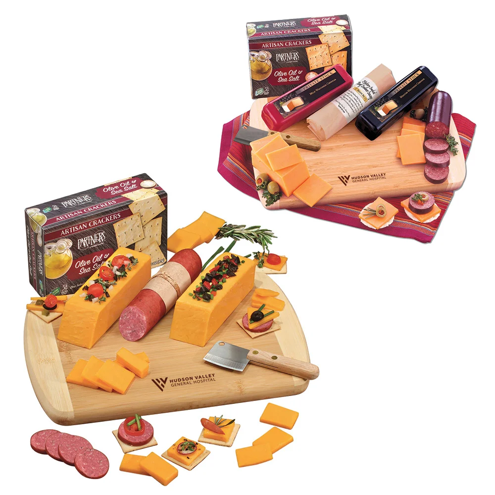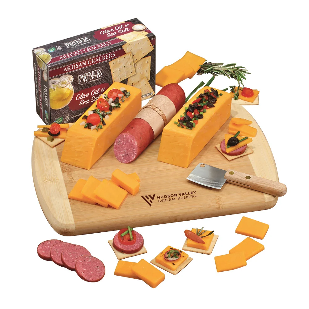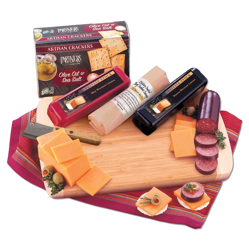 Large blocks of your choice of our naturally-aged Wisconsin cheddars or shelf-stable Wisconsin cheeses that do not require refrigeration upon receipt are paired with a five-ounce stick of tangy Beef Summer Sausage and a box of Water Crackers