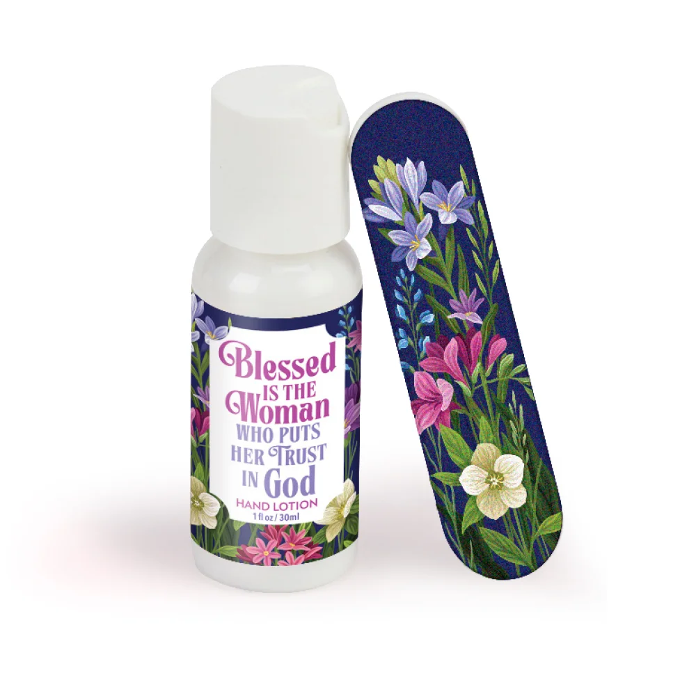 Hand Lotion & Mini Emery Board packaged in organza drawstring bag with Happy Mother's Day gift tag attached
