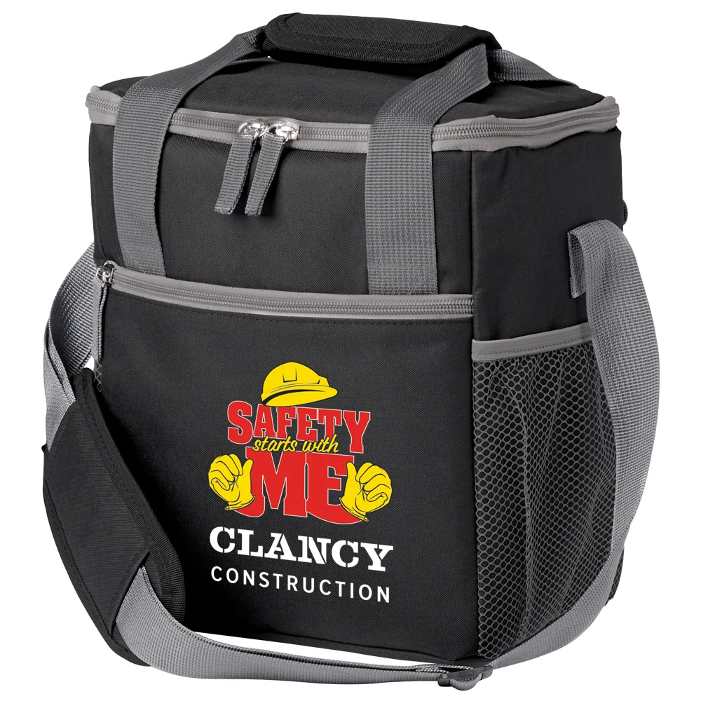 Lunch/Cooler Bag: Dual-zip, insulated main compartment keeps contents colder (or warmer) longer; Front zip pocket stashes napkins and other items; 2 side mesh pockets for a water bottle, utensils, and more; Two carry options: comfort-wrapped handles or padded, adjustable shoulder strap; Holds up to 9 cans; ID window on back; Heathered 600-denier polyester