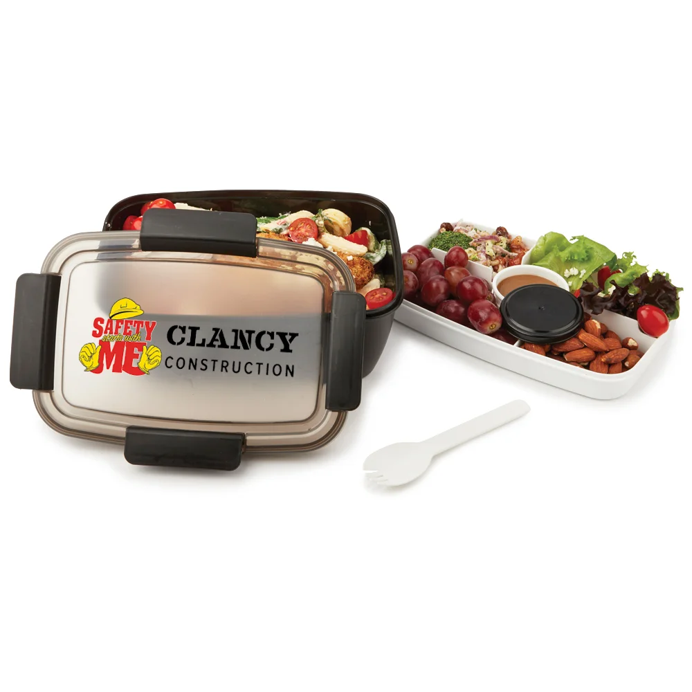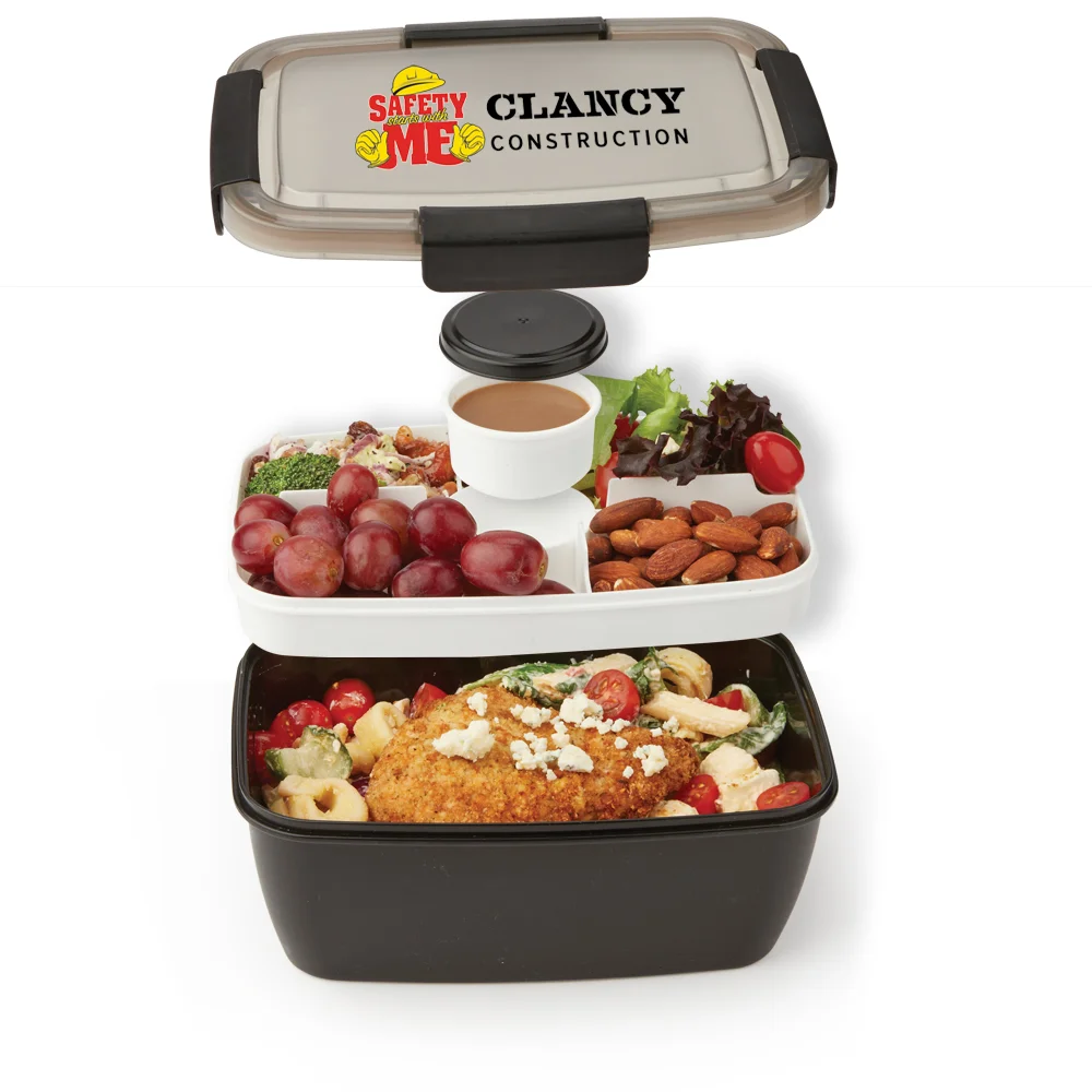 Stacker Container: Two plastic, rectangular stacking containers with a hinged, locking lid; Fork included; Airtight lid with silicone ring seals in freshness and prevents spills; Large bottom container holds 68 oz. (8.5 cups); 4-compartment top tray (2 sections hold 5 oz., 2 hold 3.5 oz.) separates snacks; Lidded, removable 3-oz. container stores dressing, toppings, or sauces; Eco friendly; Reusable; BPA free; Note: Microwave and freezer safe; Dishwasher safe after lid and compartments removed