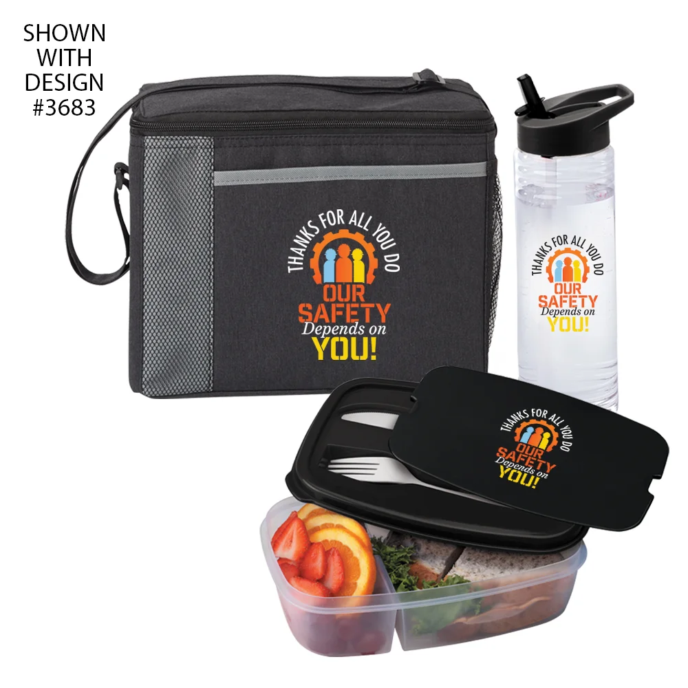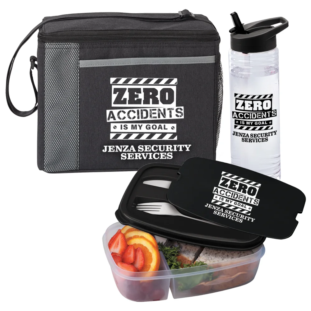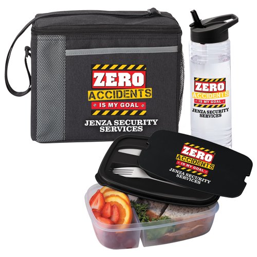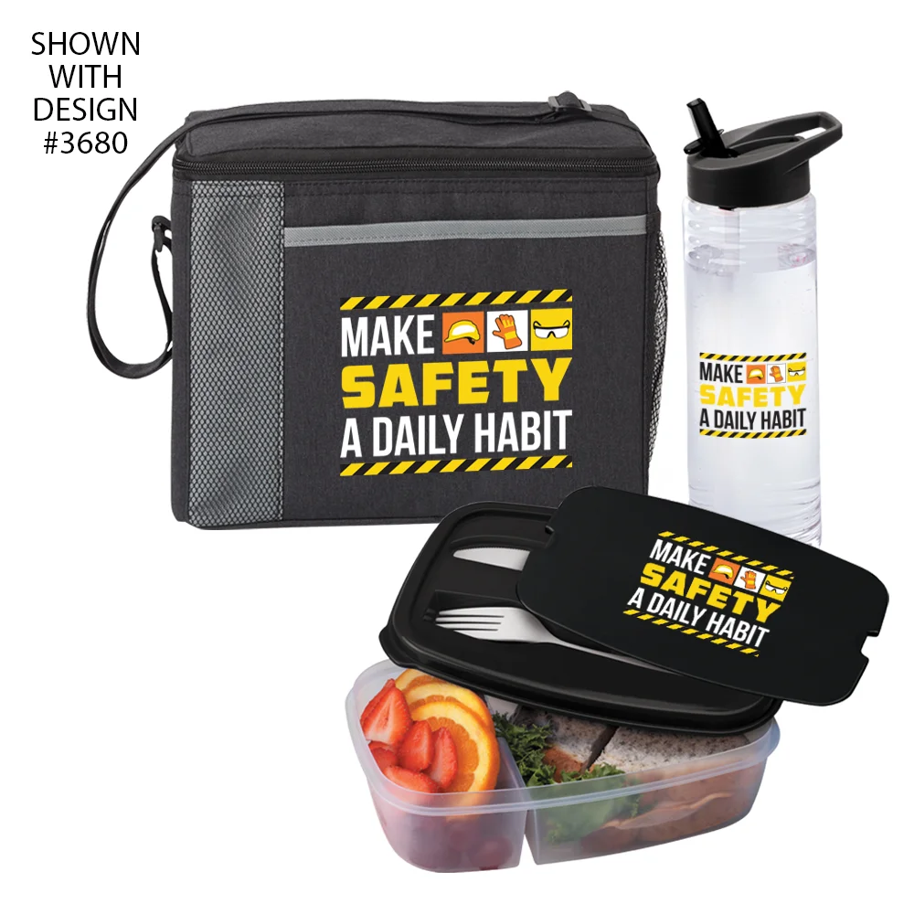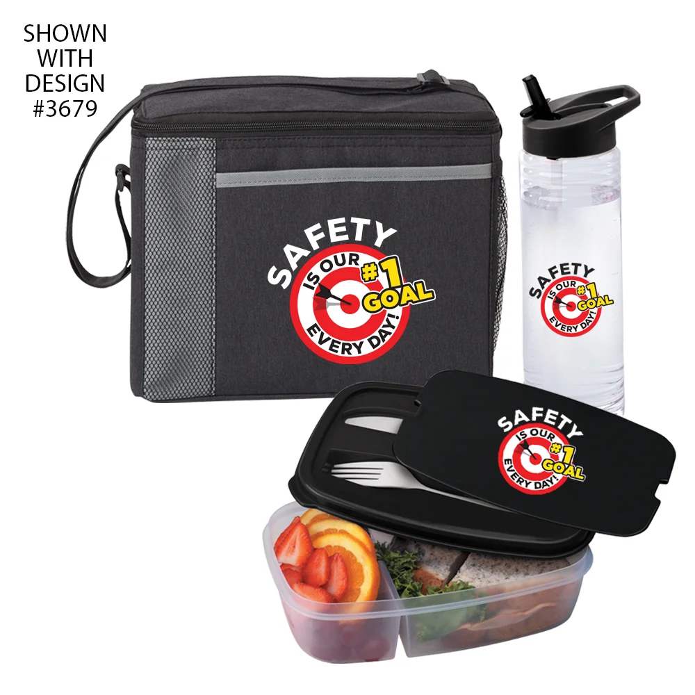 Cooler Lunch Bag: 11" X 9" X 6"; Food Conatiner: 9" X 2 1/2", X 6"; Water Bottle: 24-Oz.