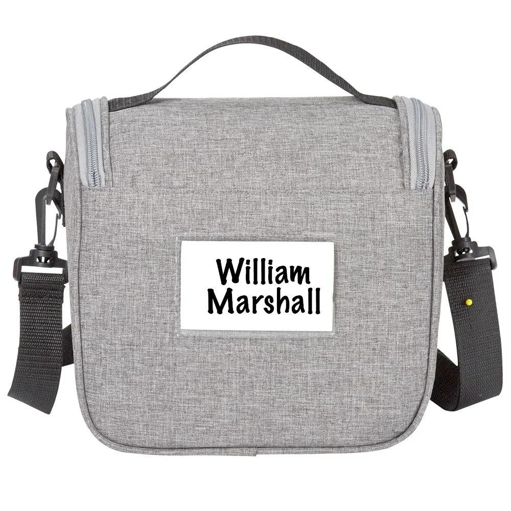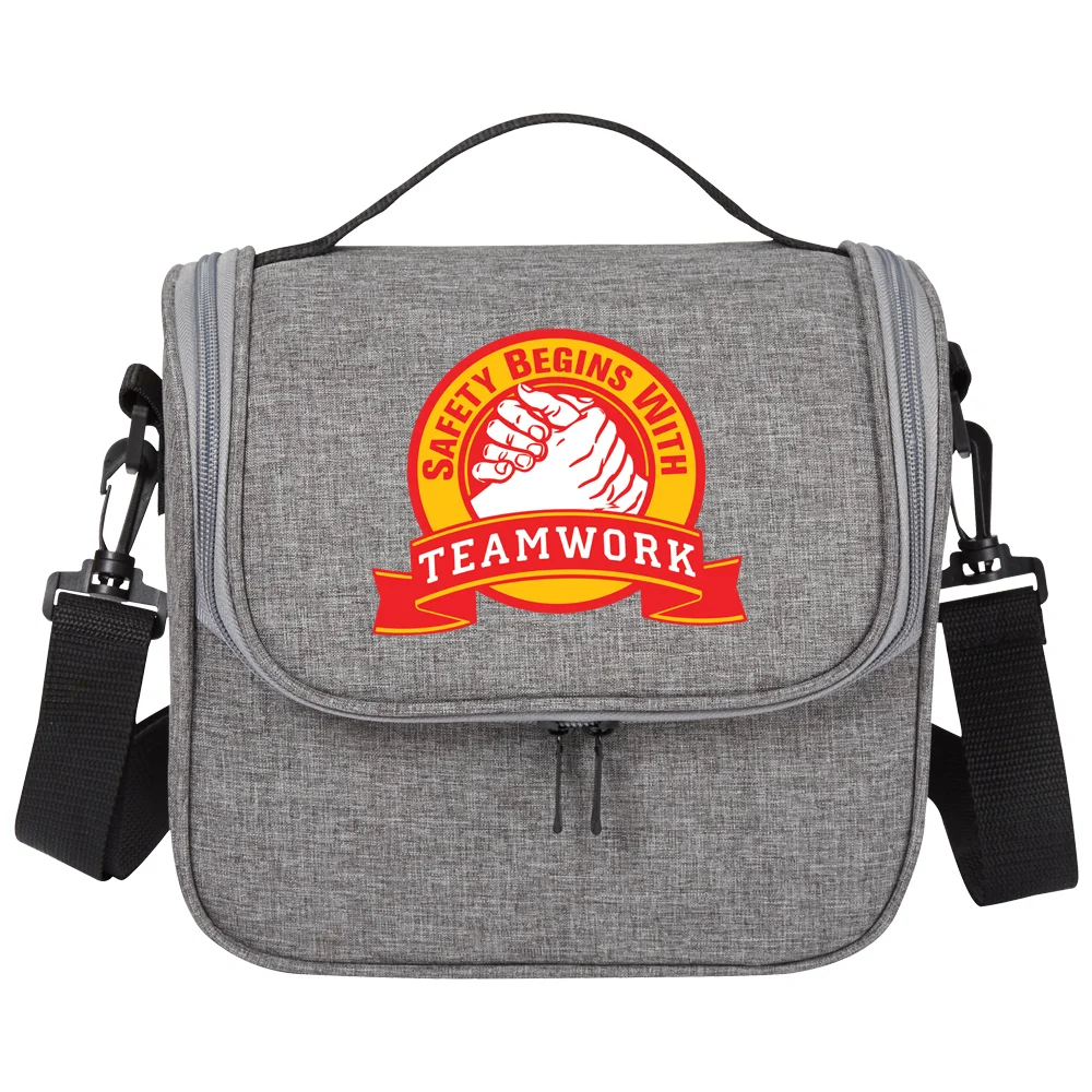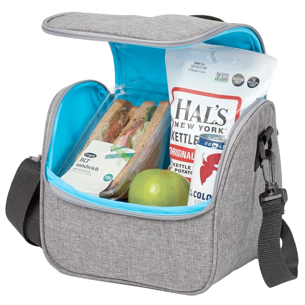 Lunch/Cooler Bag: Dual-zip, foam-insulated, leak-resistant compartment ideal for stacking containers or up to 6 cans with ice; Interior is easy to wipe clean in case of any spills; Fits most food containers for convenient meals on the go; Exterior slip pocket for napkins and quick-grab items; Heathered 300-denier material with bright-blue lining and PEVA foam insulation; Adjustable, removable strap for shoulder or crossbody carry; Top carry handle; ID window on the back