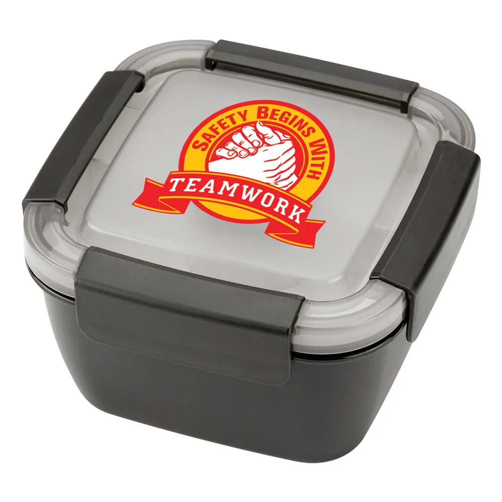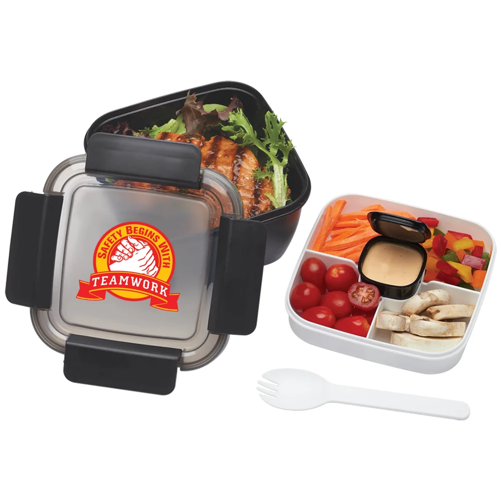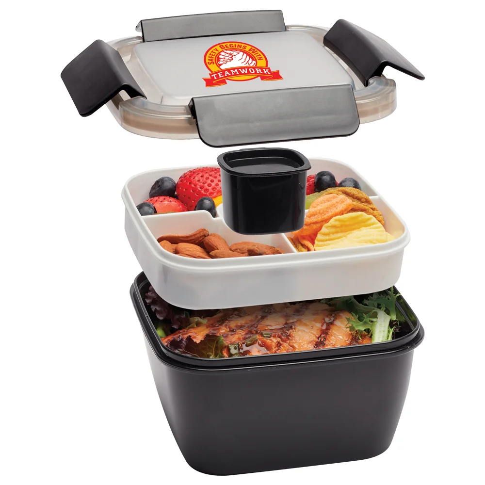 Food Container: Travel-friendly food container keeps entire meal fresh and organized; Plastic and silicone construction with hinged locking tabs creates an airtight, spill-resistant lid; Entree-sized bottom compartment holds 54 oz. (6.75 cups); Multi-compartment tray separates fruits, veggies, and sides; Sits on top of large compartment; Removable, lidded container in center holds 3 oz. of toppings, dips, or dressing; Included reusable fork tucks neatly inside; Eco friendly; BPA free; Note: Freezer, microwave, and dishwasher safe