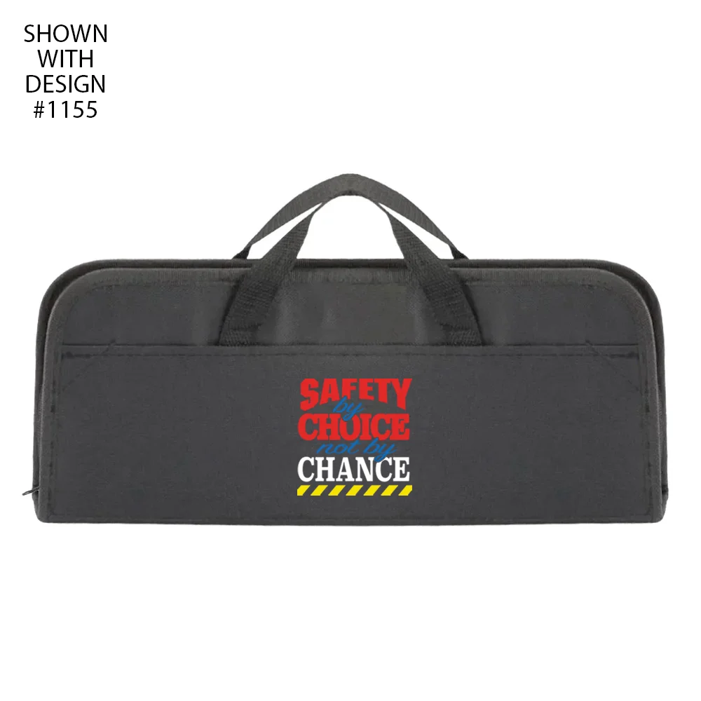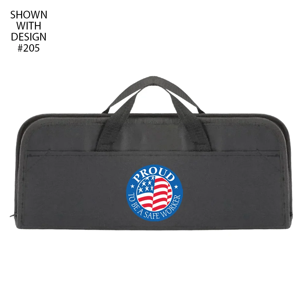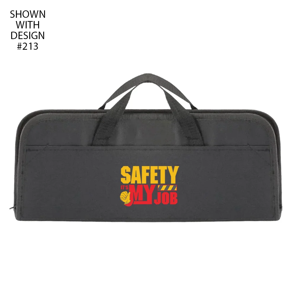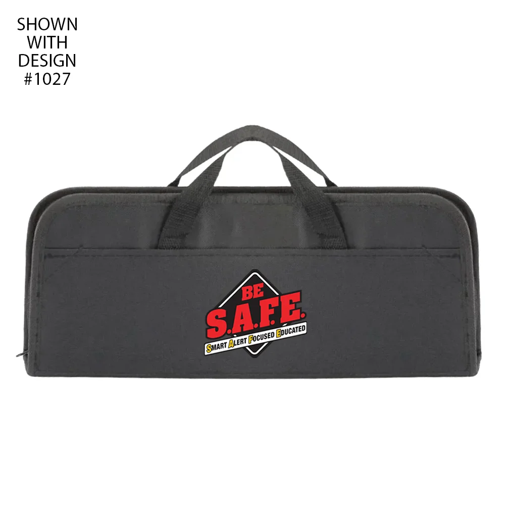 Durable 600-denier polyester carry case with zip closure, multiple interior straps to hold each tool in place, exterior storage pocket, and 12" webbing handles