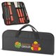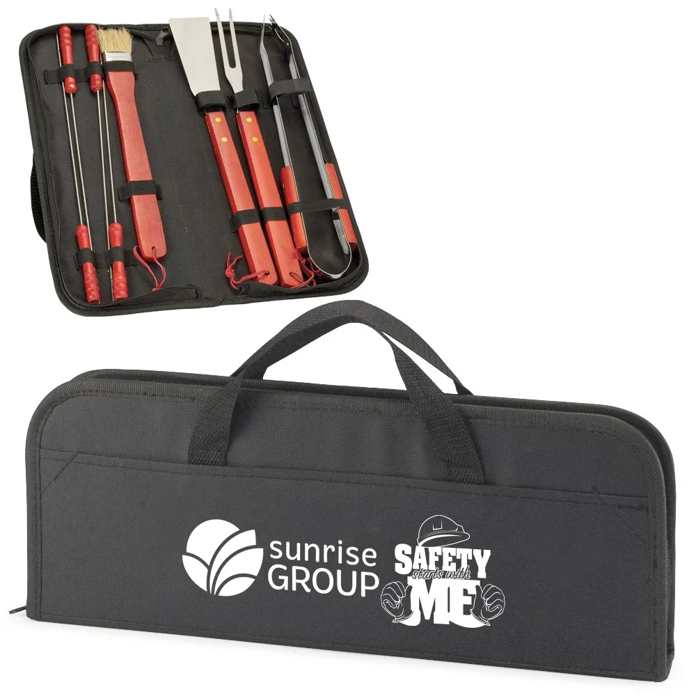 8-piece portable BBQ set includes: 1 pair of tongs, 1 fork, 1 spatula, 1 basting brush, and 4 skewers
