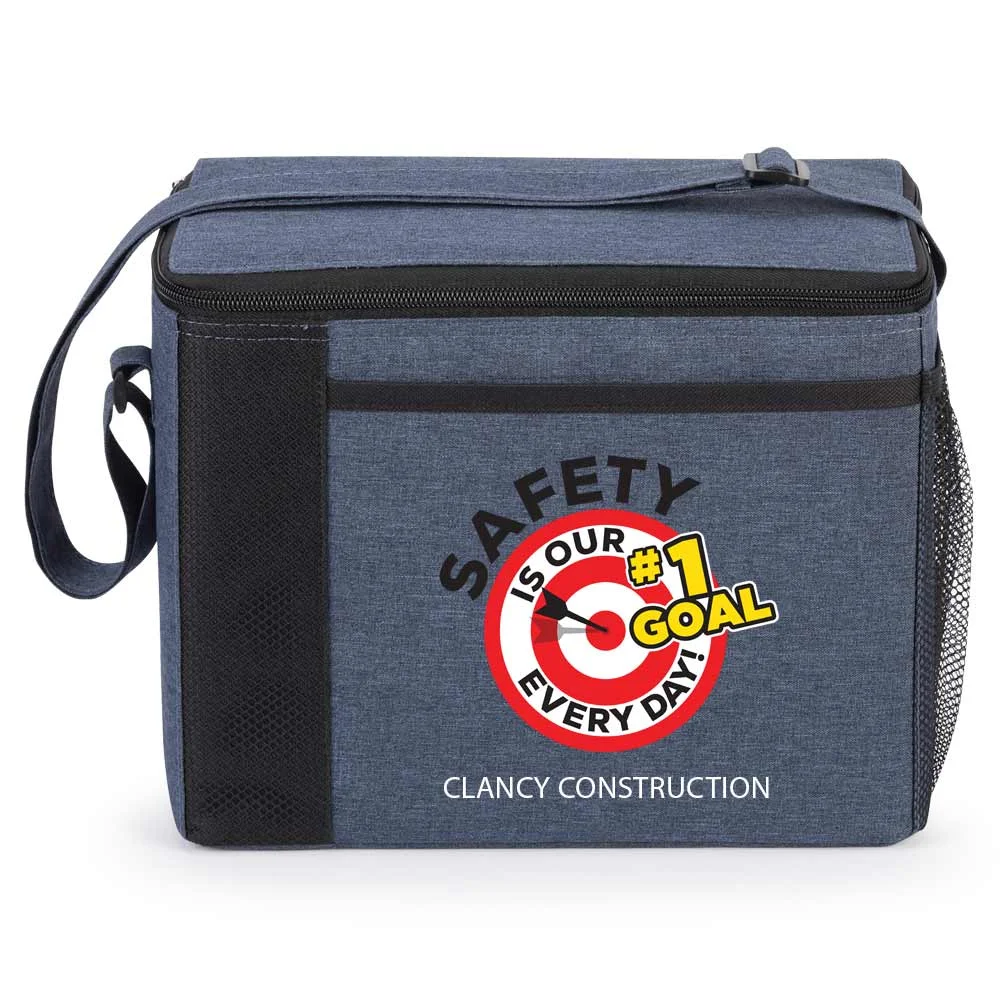 Personalized Lunch/Cooler Bag: Reusable bag that keeps contents fresh on the go; Flip-top lid with zip-around closure; Two zipper pulls for full access to large compartment; Front slip pocket for utensils or small essentials; Side mesh pocket stores even more; Insulated lining is easy to wipe clean; Strap adjusts for hand or shoulder carry; ID window on back; Holds up to 8 cans; Heathered 300-denier polyester with contrast trim