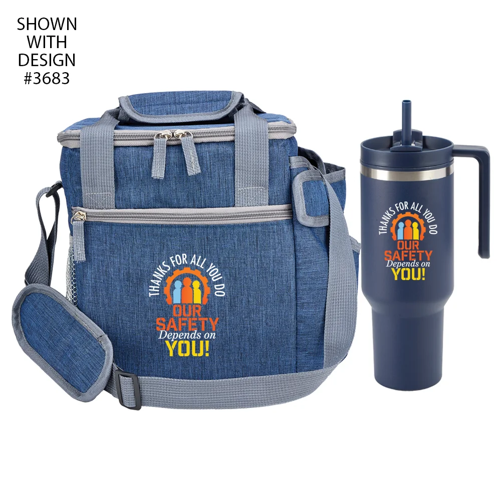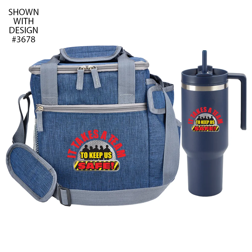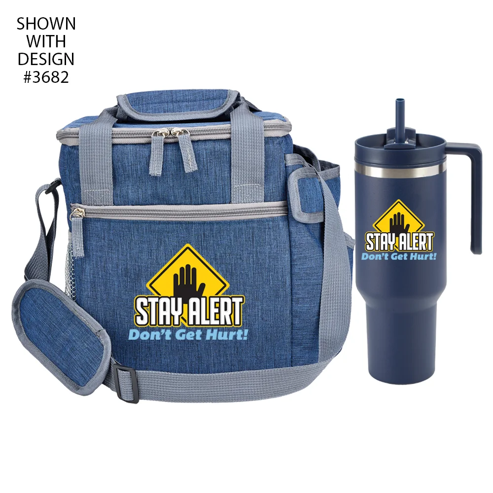 Cooler bag has a dual-zip insulated main compartment to keep contents colder (or warmer) longer; front zip pocket and side mesh pocket; large side pocket totes included 40-oz. tumbler; heathered 600 denier polyester