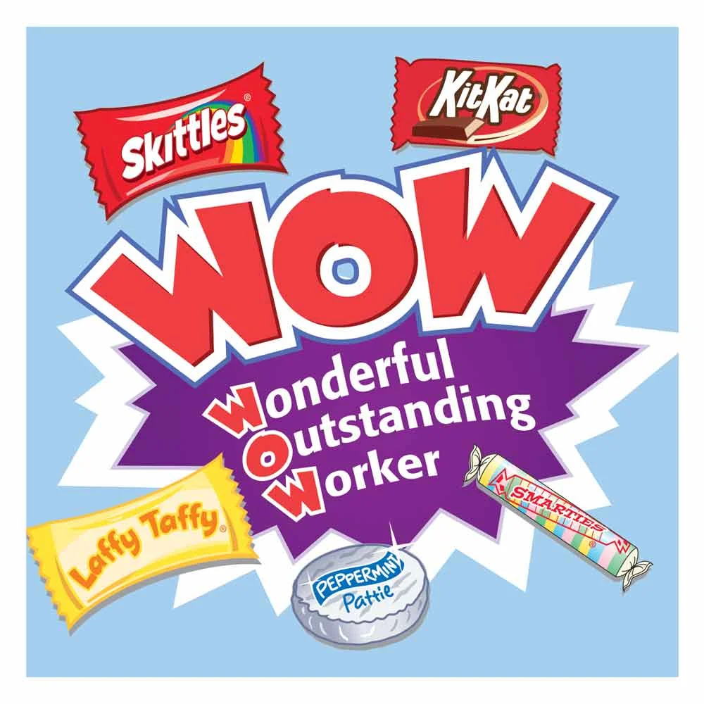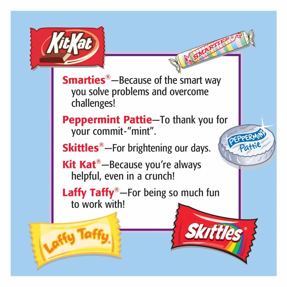 Card lists and explains the contents of this fun appreciation snack pack: Smarties® - Because of the smart way you solve problems and overcome challenges!; Peppermint Pattie - To thank you for your commit-"mint"; Skittles® - For brightening our days; Kit Kat® - Because you're always helpful, even in a crunch!; Laffy Taffy® - For being so much fun to work with!