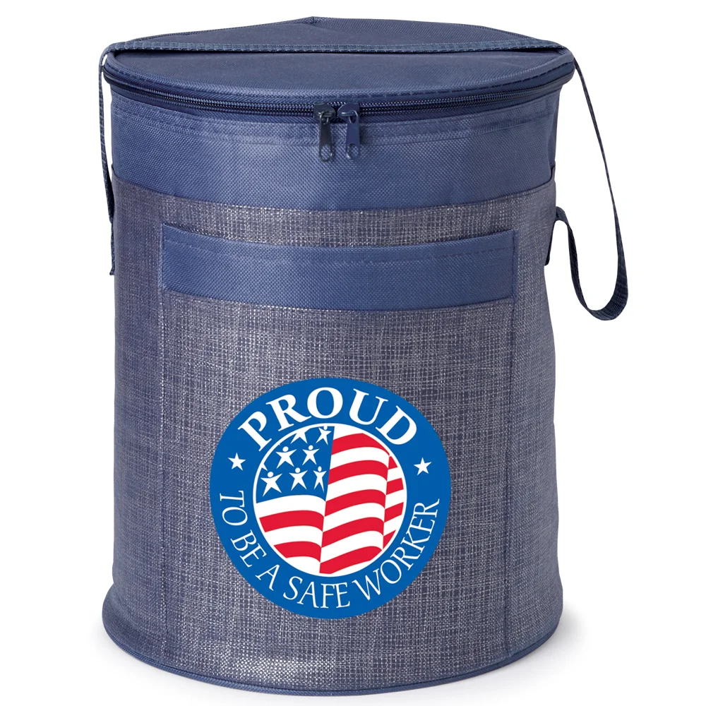 Brookville Barrel Cooler Bag: Roomy, barrel shaped; Zips shut; Insulated; Holds up to 16 cans plus ice; Exterior pocket; 19 1/2" carry strap; Folds flat for storage; 80-gsm. non-woven polypropylene/600-denier polyester trim