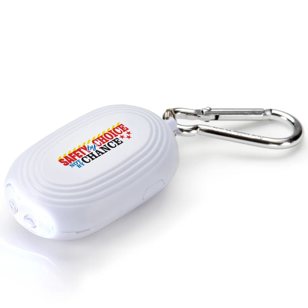 Personal Safety Mate Alarm & Flashlight With Carabiner: Pull pin to sound 110-dB alarm, push pin to turn off; Audible up to 225 feet away; 2 bright 3-lumen LEDs shine over 60 feet; Lights flash when alarm is active; Lightweight, durable plastic with carabiner; 4 replaceable cell batteries & instructions included; Gift box included