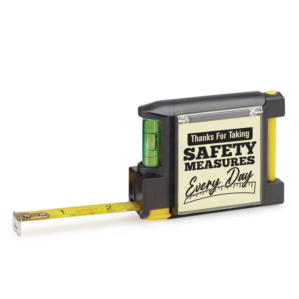 Deluxe Tape Measure: Includes: tape measure, sticky pad with plastic cover, pen, & level; 10-foot metric & standard retractable steel measuring tape locks into place; Mini pen slides into the right side; Belt clip on back keeps hands free while working