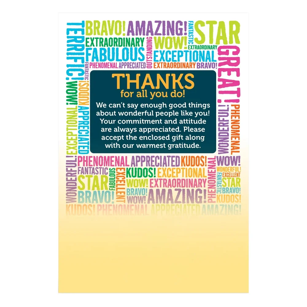 Personalized Appreciation Card:Thanks for all you do! We can't say enough good things about wonderful people like you! Your commitment and attitude are always appreciated. Please accept the enclosed gift along with our warmest gratitude.